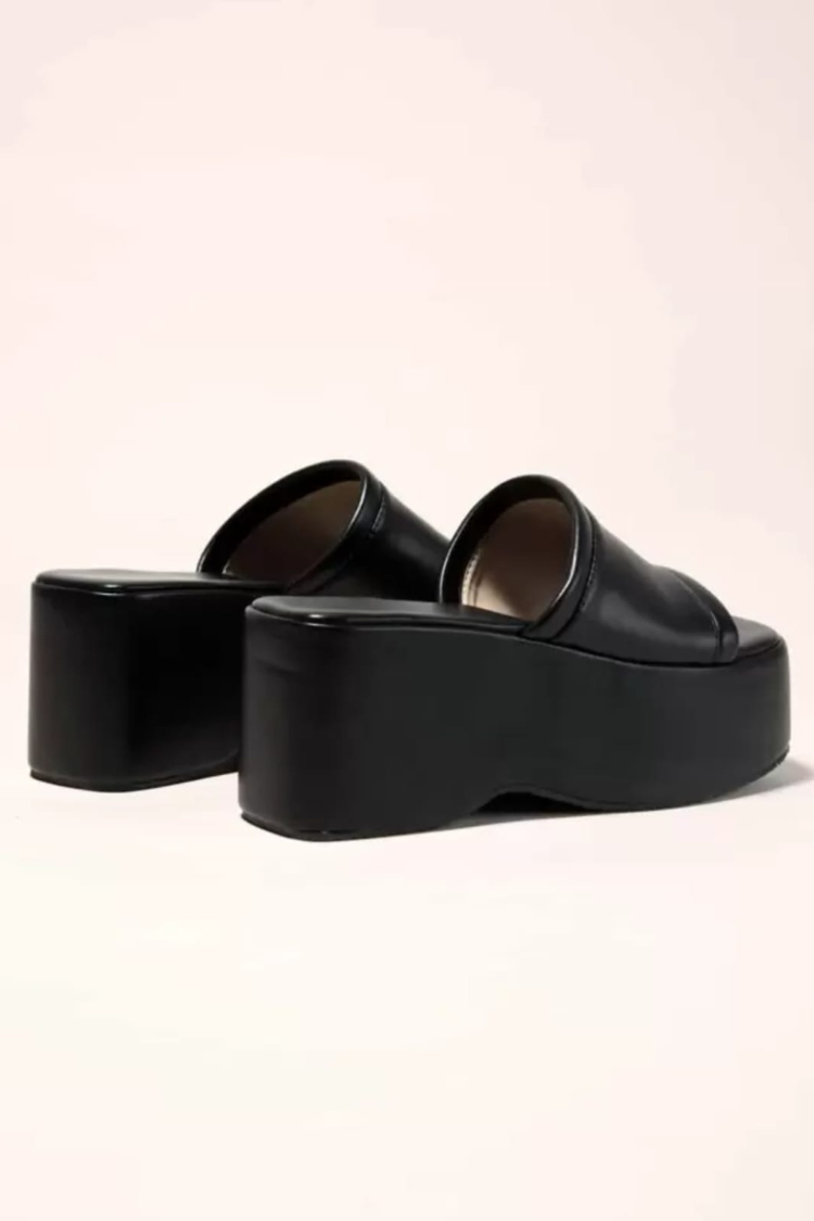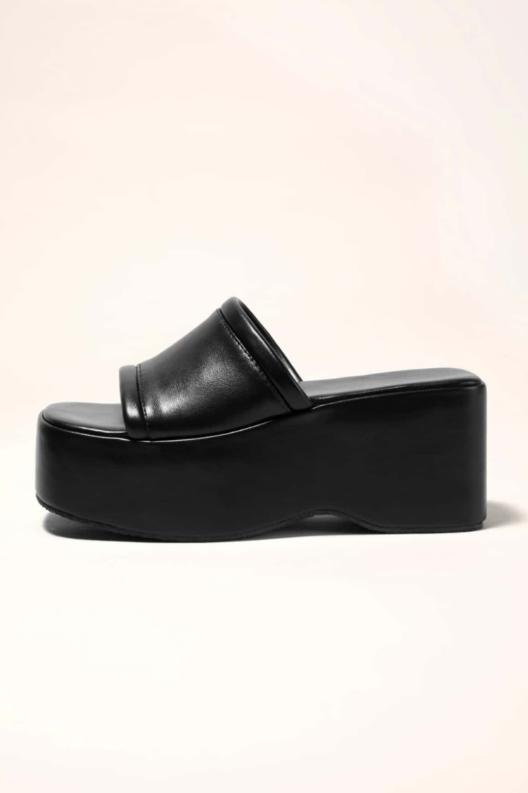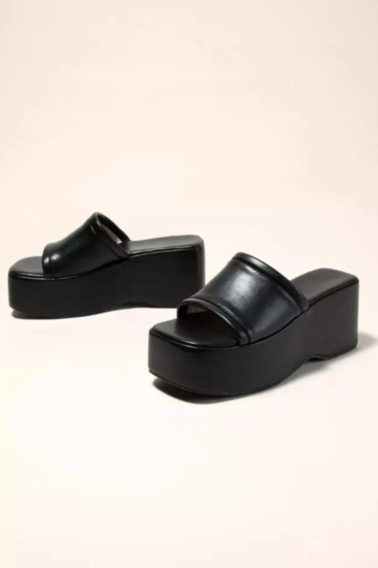 Step up your fashion game with the DINSIM Black Platform Wedge Mule, designed for a modern and bold look. These slip-on sandals feature a smooth black faux leather upper and a sturdy mid wedge platform, blending statement style with elevated comfort. The open toe design combined with a wide cover gives a contemporary and versatile silhouette, ideal for summer parties, evening events, or daytime outfits. Make these mules your ultimate choice for glamorous occasions or chic street style.